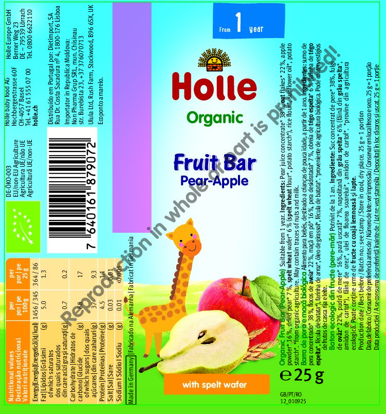 Pear juice concentrate* 38%, OAT flakes* 22%, apple powder* 16%, dried pear* 7%, SPELT WHEAT wafer* 6 % (SPELT WHEAT flour*, potato starch*), rice flour*, sunflower oil*, potato starch*.