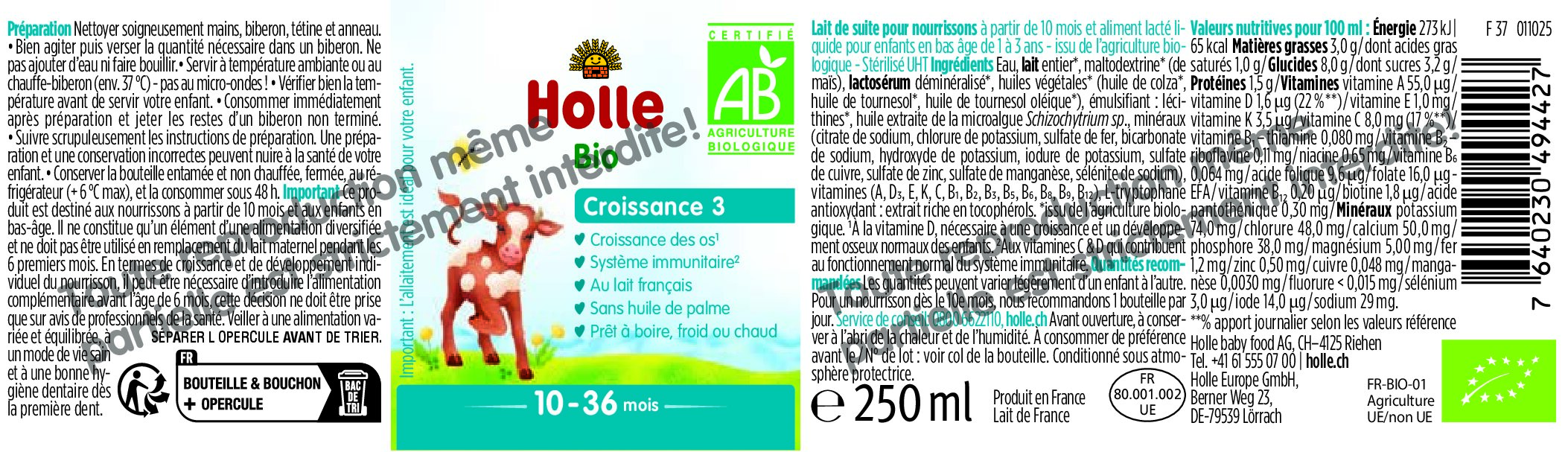 Water, whole MILK*, maltodextrin, demineralized WHEY powder*, vegetable oils* (rapeseed oil*, sunflower oil*, high oleic sunflower oil*), emulsifier: lecithins*, oil from the microalga Schizochytrium sp., sodium citrate, potassium chloride, ferrous sulfate, sodium bicarbonate, potassium hydroxide, potassium iodide, copper sulfate, zinc sulfate, manganese sulfate, sodium selenite, vitamins (A, D₃, E, K, C, B₁, B₂, B₃, B₅, B₆, B₈, B₉, B₁₂), L-tryptophan, antioxidant: extract rich in tocopherols.