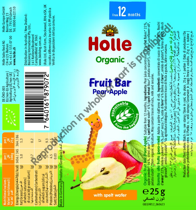 Concentrado de jugo de pera* 38%, copos de avena* 22%, polvo de manzana* 16%, peras* deshidratadas 7%, oblea de trigo espelta* 6% (harina de trigo espelta*, almidón de patata*), harina de arroz*, aceite de girasol*, almidón de patata*.