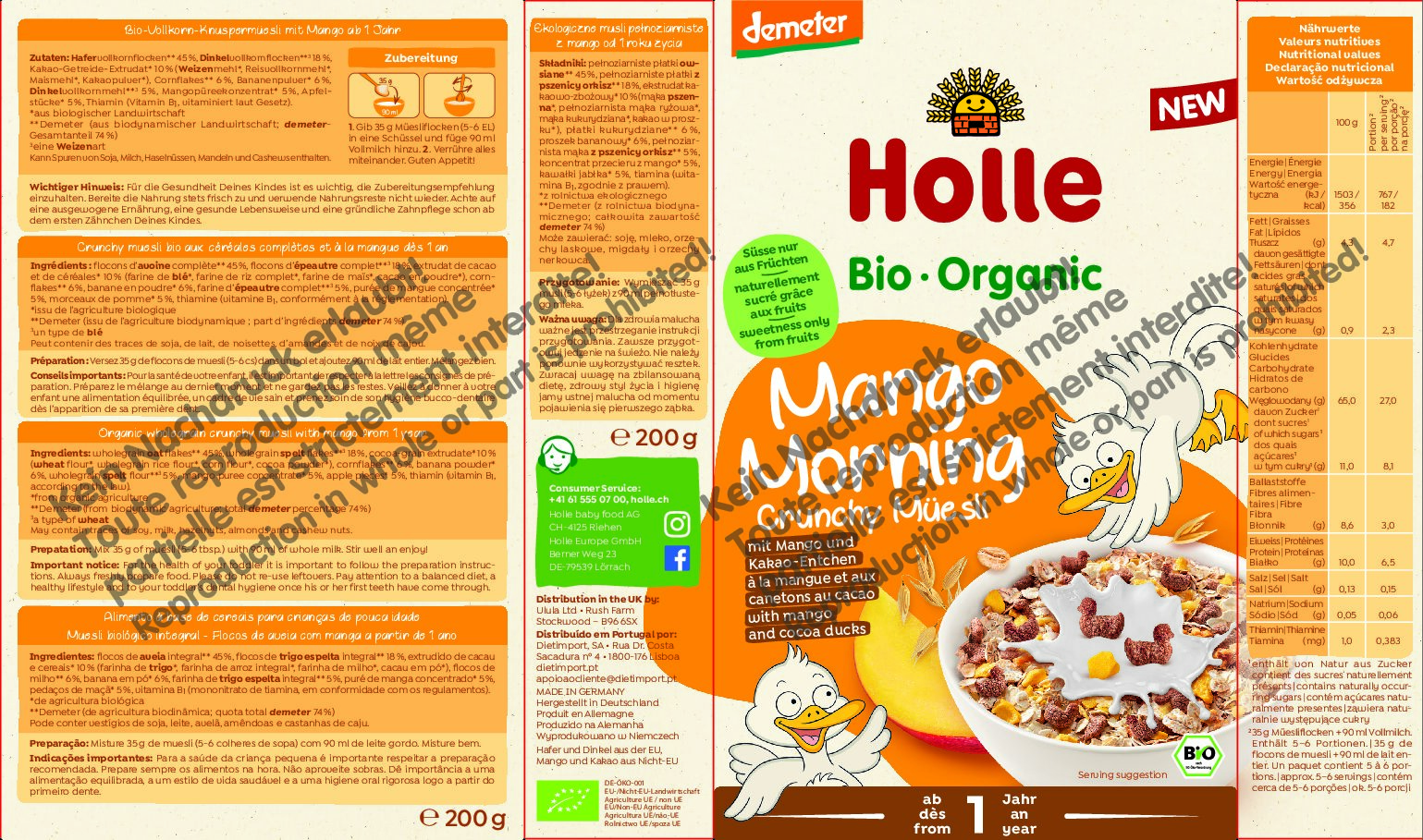 Copos de AVENA integral** 45 %, copos de ESPELTA integral¹ 18 %, extruido de cereal con cacao* 10 % (harina de TRIGO*, harina integral de arroz*, harina de maíz*, cacao en polvo*), copos de maíz 6 %, polvo de plátano* 6 %, harina integral de espelta**¹ 5 %, concentrado de puré de mango* 5 %, trozos de manzana* 5 %, tiamina (vitamina B1, según la ley).