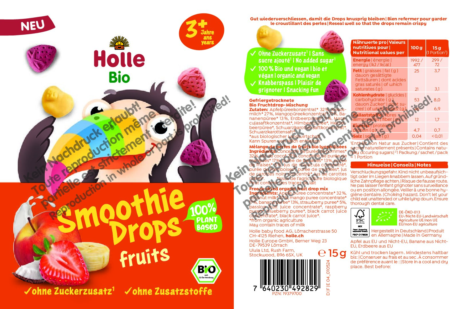 Descubre los deliciosos Holle Smoothie Drops fruits: un snack infantil vegano y liofilizado que combina frutas puras con cremosa leche de coco. Estos especiales drops, que se disuelven rápidamente en la boca, ofrecen un sabor afrutado y delicioso para todos los pequeños y grandes amantes de los snacks. Elaborados con un 100% de ingredientes orgánicos y sin azúcares añadidos, el delicado proceso de liofilización conserva las valiosas vitaminas y el sabor natural de las frutas.
