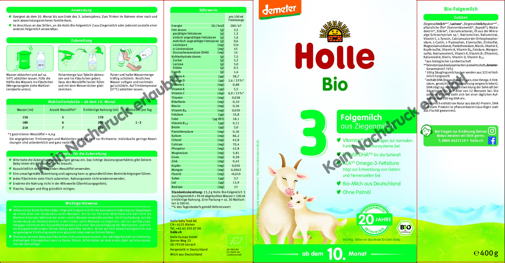 Diese Babymilch ist ab dem 10. Monat als Bestandteil einer gemischten Ernährung aus Flaschen- und Breimahlzeit geeignet. Mit Ziegenmilch in biodynamischer Demeter-Qualität: - Ziegen muss an 365 Tagen pro Jahr ein Zugang zu Frischluft garantiert werden.* - Sie werden mit 100% Bio-Futter ernährt, davon mindestens die Hälfte in Demeter-Qualität direkt vom Hof oder aus der Region. - Ihre Hörner dürfen sie behalten: es sind ihr Sinnes- und Kommunikationsorgan. * laut EU-Öko-Verordnung- Faltschachtel zu 100% recyclingfähig. Besteht zu 85-95% aus rezykliertem Papier, der Rest aus 100% FSC-zertifizierter Frischfaser, für langfristig erhaltene Wälder